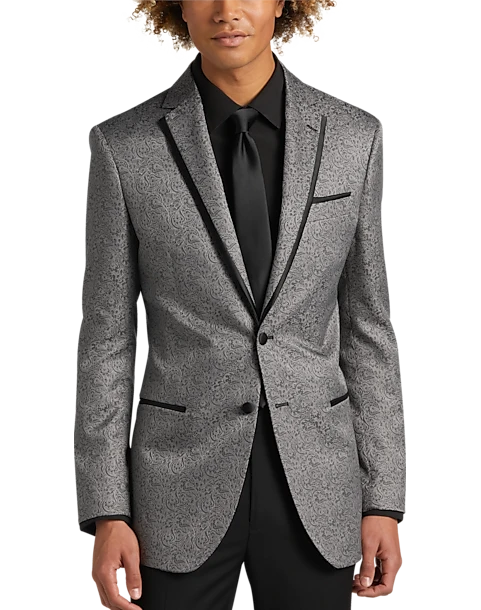 Styled for those special nights out, this dinner jacket from Egara features a satin-edge notch lapel and a tradition paisley pattern in warm gray.