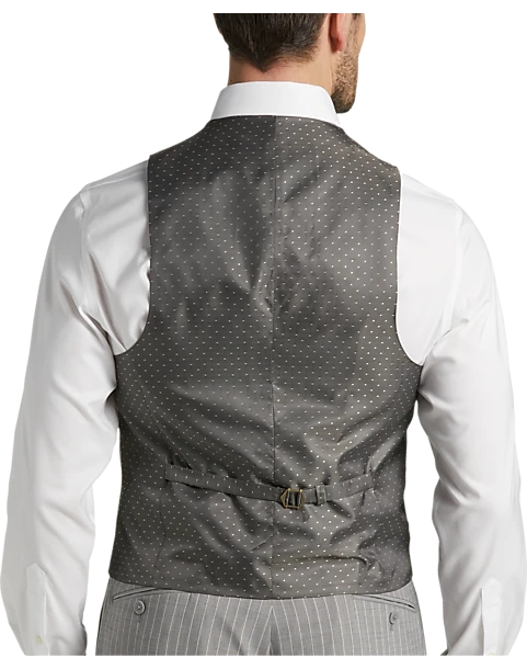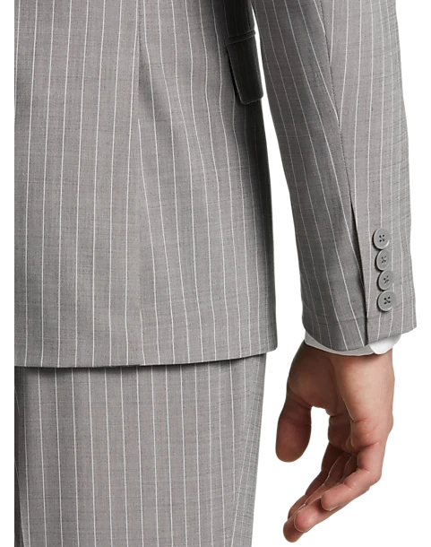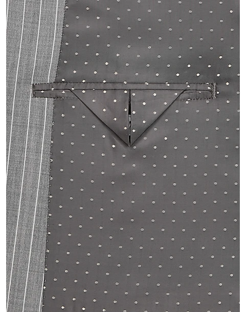 In a Classic Fit this fine suit from Michael Strahan features a traditional gray stripe. A notch lapel coat flat-front slacks and a five-button vest complete this versatile look.